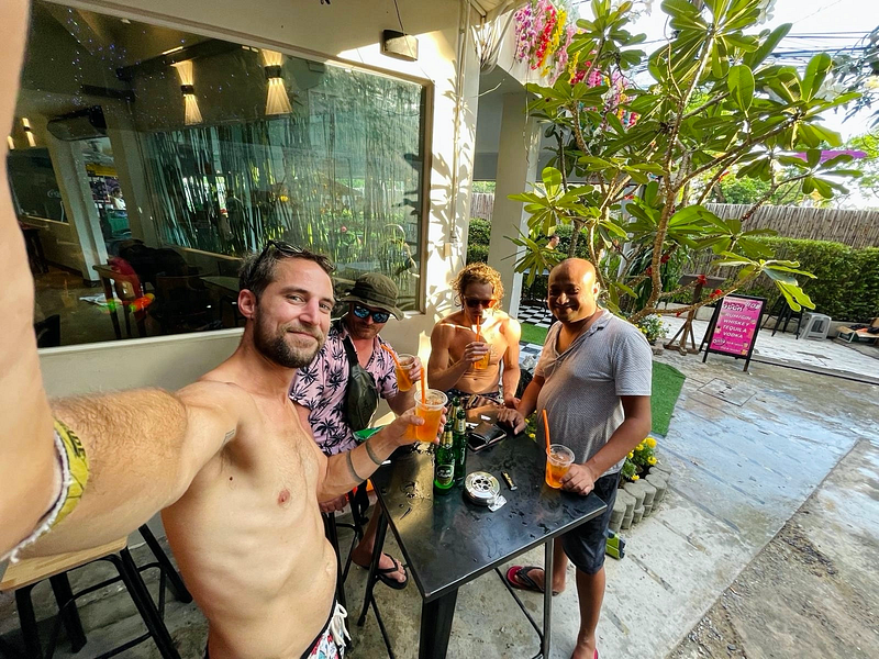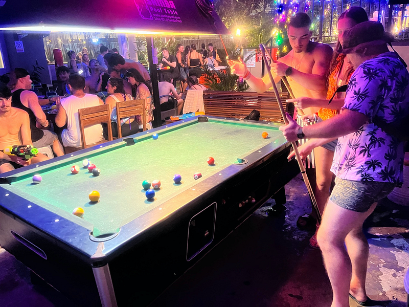 i thought in my head what would be funny is that i would walk around drinking all day and take notes in my phone. in the morning i’d be able to write a piece about all of the bizarre observations of the day. what i discounted was just how intensely they meant that it was a street water fight that never ended. i rarely found a chance to remove my phone from its water proof pouch. i also was spending considerable time laughing and shooting pool and hanging out with this motley collection. birds of a feather.