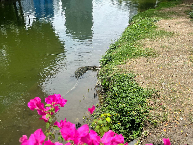 lumphini park is bigger than some towns. it has beautiful trees. a small lake. also, dinosaurs. little guys.