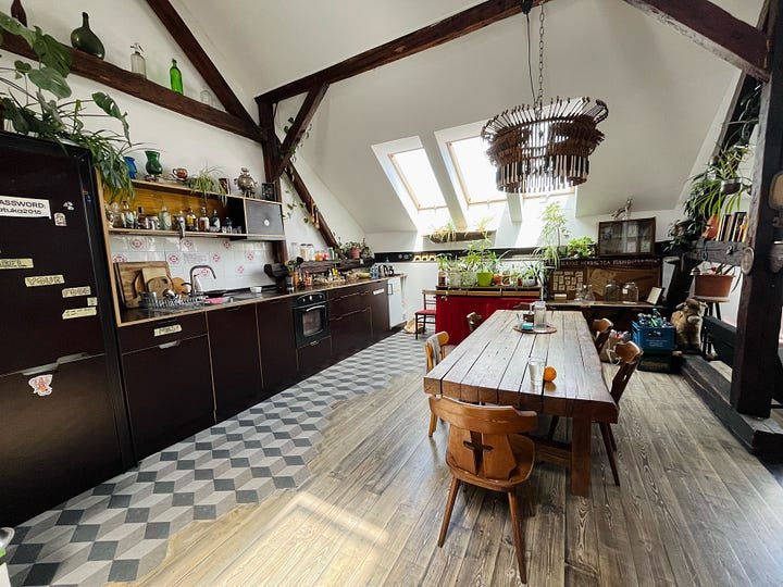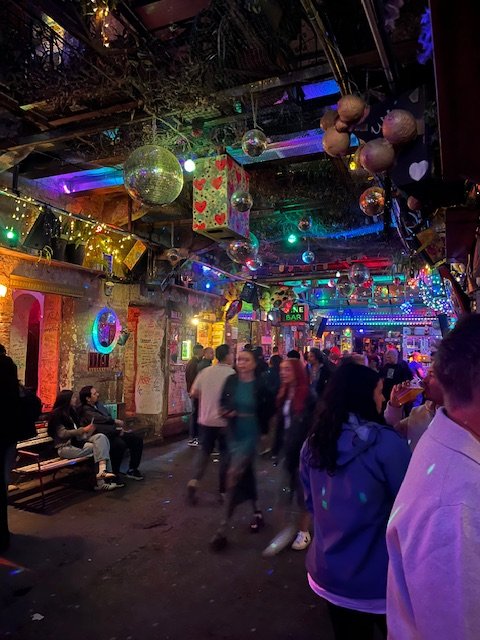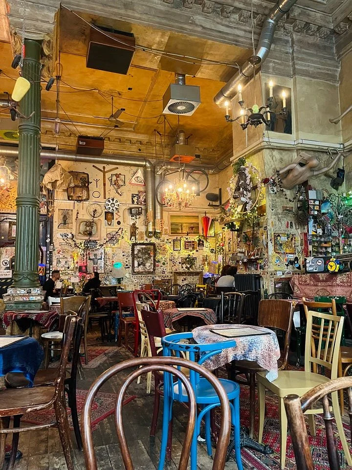 in budapest there is a trend for the last quarter century of ruin bars. they embrace the decay of the buildings, house mismatched furniture, and the decor is like a dive bar regular went to a thrift store on a pound of coke and then collaged the walls. the ruin bars are fantastic. i have described tom’s burnt down cafe on madeline island as mad max meets jimmy buffet concert, and if tom’s was just dropped in the middle of a city it would qualify as a ruin bar. that is the closest thing i can think of to this.