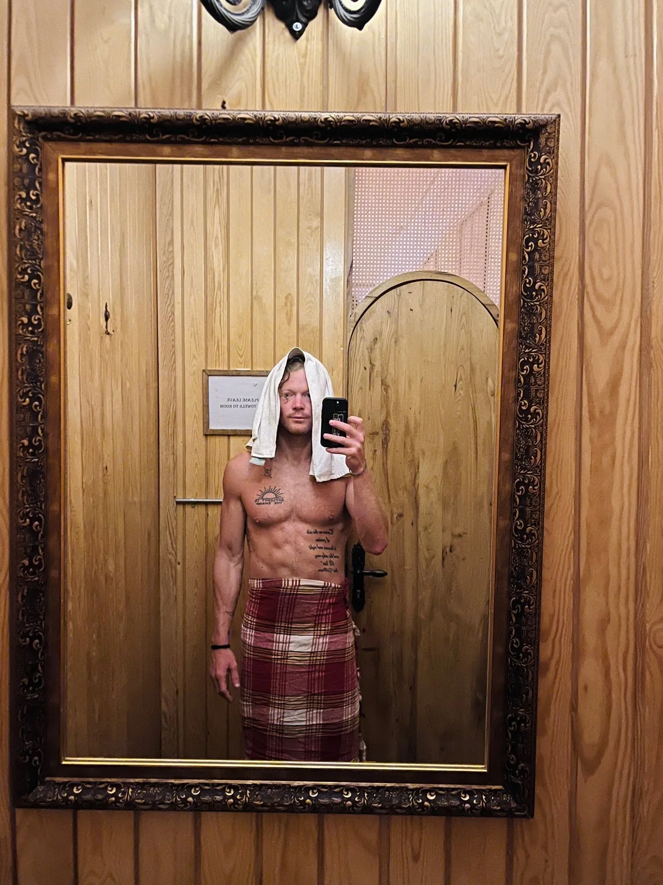 after the bubble rub he told me to sit up and was pouring bowls of water over me. baptism-esque. he said “ready” and without even thinking of what the question might mean i said yes — in for a penny in for a pound — and he dumped a bowl of cold water down the front of my shorts, smiled at me, and said “good morning”.